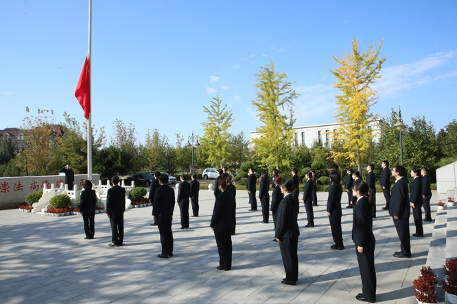 9月30日,通辽铁检院楼前广场庄严肃穆,伴随着雄壮的《义勇军进行曲》,鲜艳的五星红旗冉冉升起,全体检察人员肃立行礼,目光坚定炽热。“望着国旗升起的那一刻,自豪感和责任感油然而生。”一名青年检察人员感慨道。升旗仪式不仅是一次庄重的爱国主义教育,更是一场初心使命的精神洗礼,质朴的方式凝聚全员共识,激励大家以更坚定的信念守护公平正义,以更务实的行动践行司法为民。